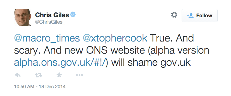 The article was not without (high profile) supporters and they debated the matter heartily with the many advocates of the work GDS have done. Despite being on leave (in theory) I followed the debate closely and was pleased, if amused, to find ONS on the different side of an online debate about Government websites — we were being held up as a positive example (or rather the Alpha was)!