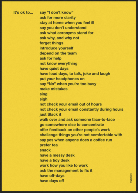 [5] It’s ok to say what’s ok — this is a fantastic primer for new (and not so new) staff at GDS to encourage openness and collaboration. It is a great list and is already finding itself printed out in offices far from GDS HQ. The big challenge though is embedding those behaviours top to bottom in any organisation.