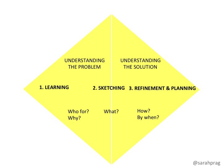 Personally I like to be able to confidently answer the questions in Sarah’s diamond (below) but your mileage may vary. Maybe you want answers to all the GDS questions above, or the DTO version or maybe even the Design Council ‘double diamond’ technique. As long as you learn what you need to learn to move to the next phase with confidence then it takes as long as it takes — whether that be two weeks or twelve. Don’t rush understanding your users — getting that right will underpin everything you do from that point on.