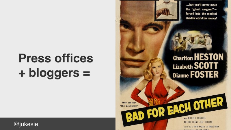 I have a lot of respect for press teams. I have worked with some amazing press officers (especially at the Medical Research Council) but blogs and press releases are not the same thing. They do not have the same goals or the same audiences. Once blogs become successful enough to catch the eye of the Press Office it is probably already too late. Especially in (and around) Government. Once people not involved in the work are checking for anything other than typos you have lost — especially if they have sign off.