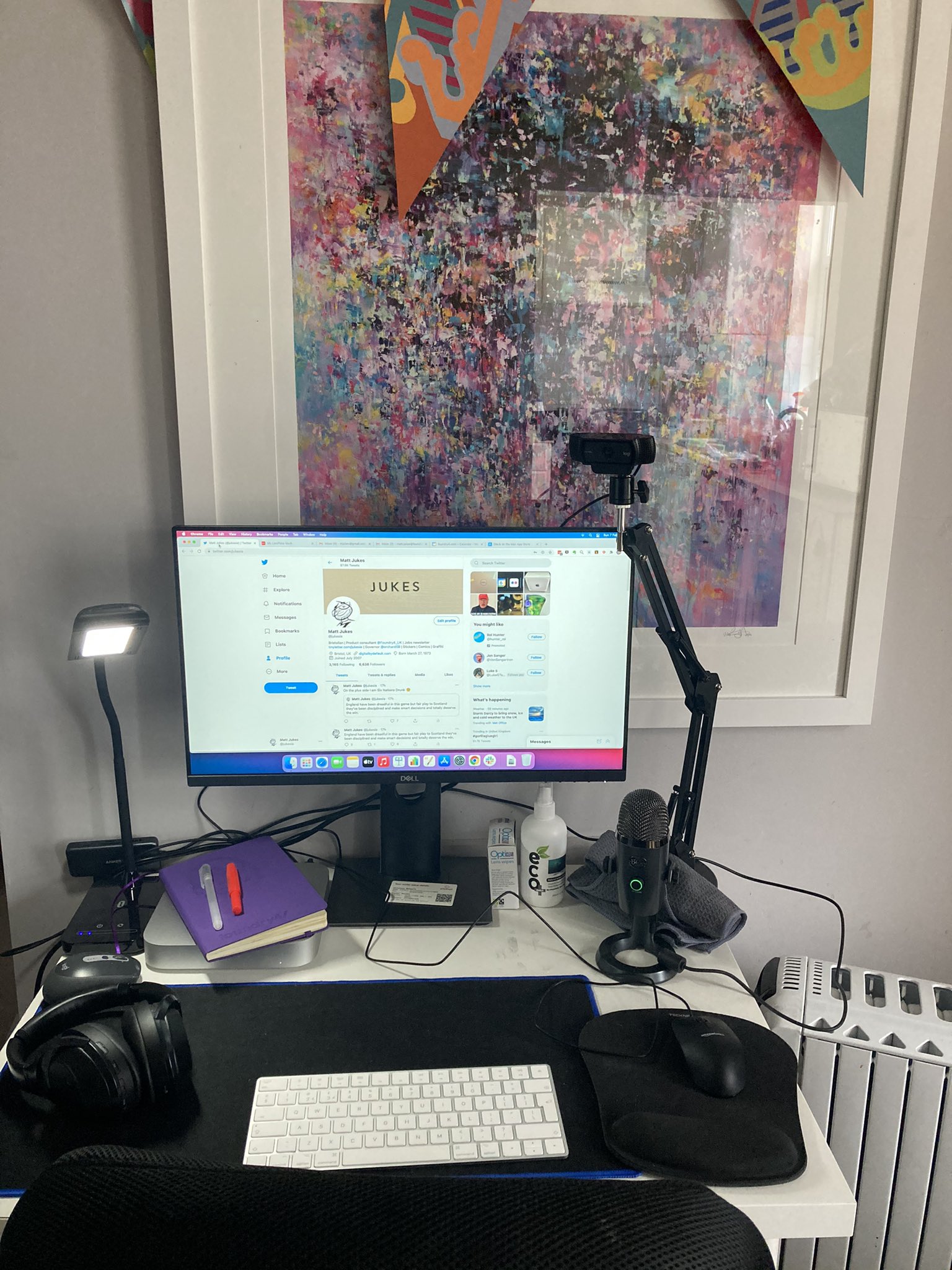 I have a Mac keyboard, a Logitech M590 bluetooth mouse, a Logitech C920 webcam on a posable arm. My microphone is a Blue Yeti Nano. My desk lamp has been a real win – stops me looking like I’m in a cave on calls and really helped lessen my eye strain.