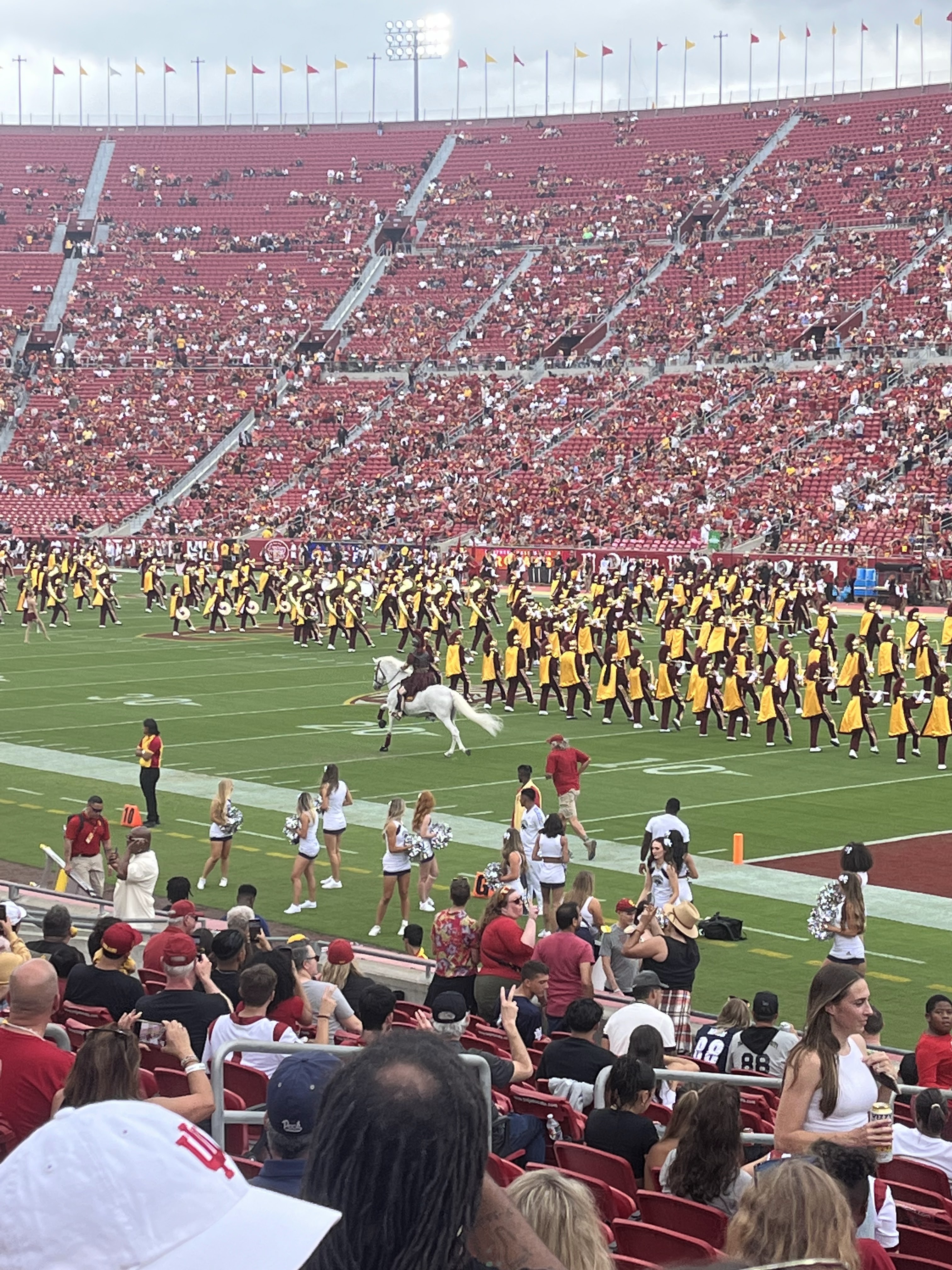 I’d say more than 90% of attendees wore USC merchandise – it was a sea of colour and people ate so much! It all feels different to the sports I’m used to – weirdly I’d say it was closer to cricket as a spectator culture than football or rugby. It takes ages. People come and go. Wander off or turn up late. The atmosphere feels artificial with the band and MC doing so much heavy lifting – and this was with USC crushing Nevada.