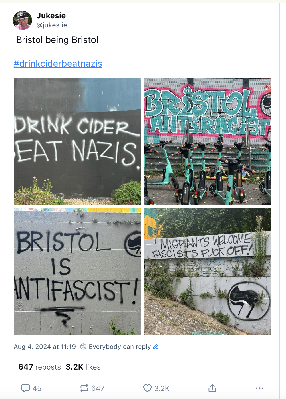 Bristol responded to the right-wing wanker-fest in a very Bristol manner (even more so on Wednesday) and I took a few pics of the aftermath and posted them on Bluesky. 600+ reposts and 3000+ likes later I felt like a very minor Bluesky celeb with lots of new followers who will inevitably be disappointed with my usual nonsense.
