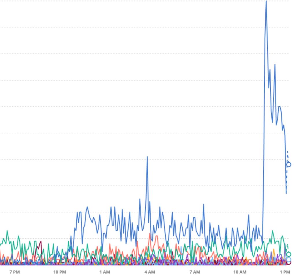 A chart showing activity from various countries on Bluesky. The UK, in blue, is experiencing a huge spike.